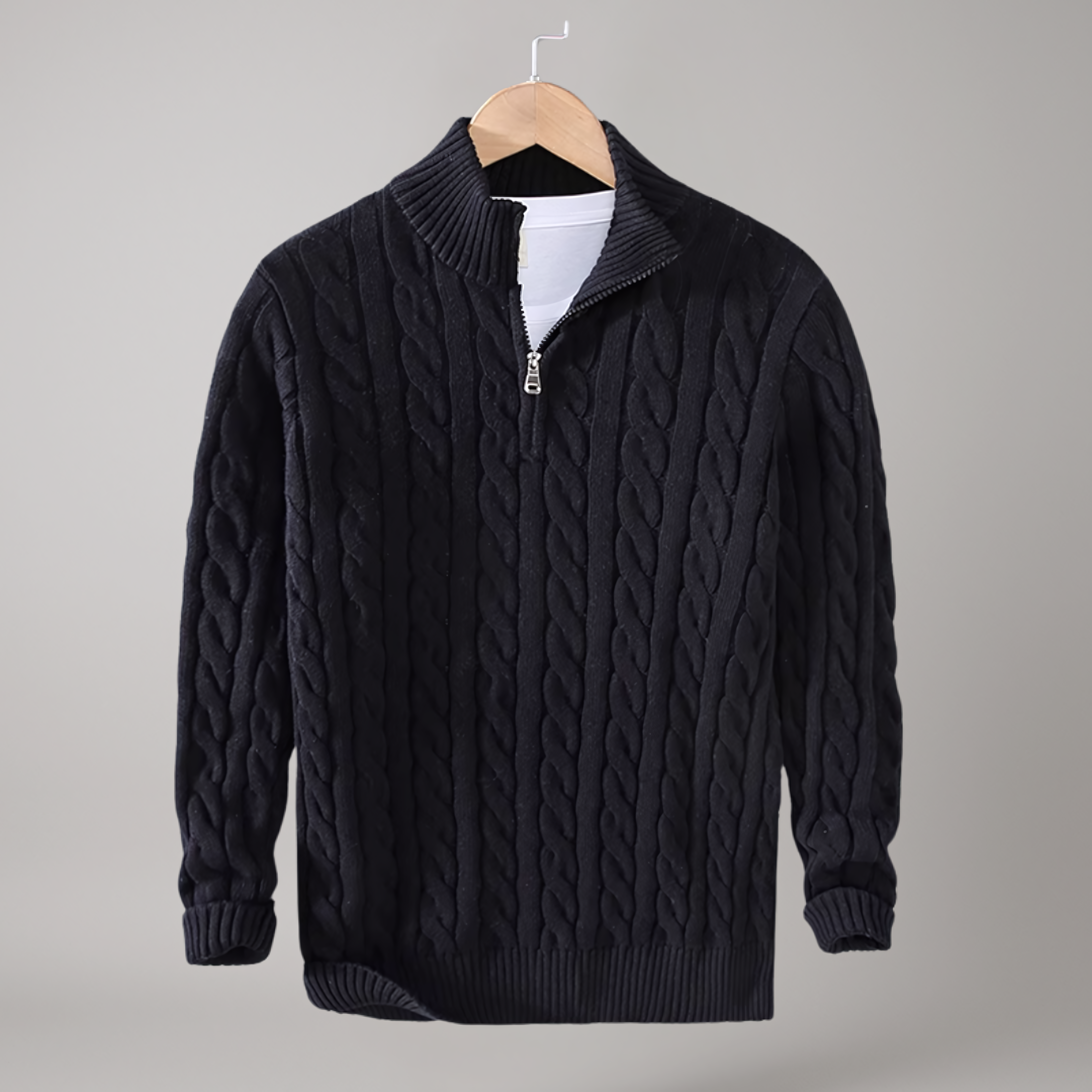 Entdecken Sie zeitlose Eleganz mit unserem Herren Strickpullover mit markantem Zopfmuster und praktischem halbem Reißverschluss. Der hochwertige Baumwoll-Mix sorgt für angenehme Wärme und höchsten Tragekomfort – ideal für Herbst und Winter. Der gerippte Stehkragen mit Zip verleiht dem Pullover eine moderne Note und macht ihn zum vielseitigen Begleiter – ob leger mit Jeans oder stilvoll über einem Hemd.