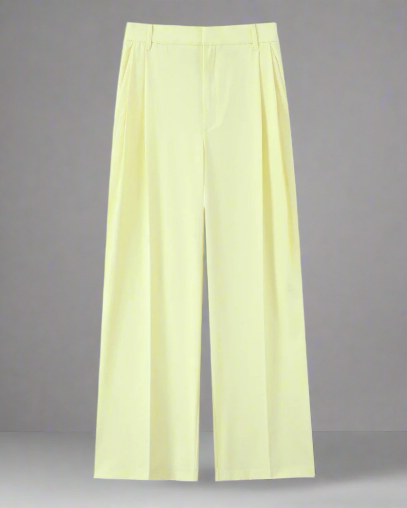 Fresh, modern, and confident: "Lemon Glow" brings color and class to your wardrobe. This two-piece set consists of a tailored vest with a deep V-neck and elegant buttons, and matching high-waisted, straight-leg trousers. The delicate pastel yellow tone gives the outfit a light, summery feel—perfect for warm days, events, or stylish street looks.